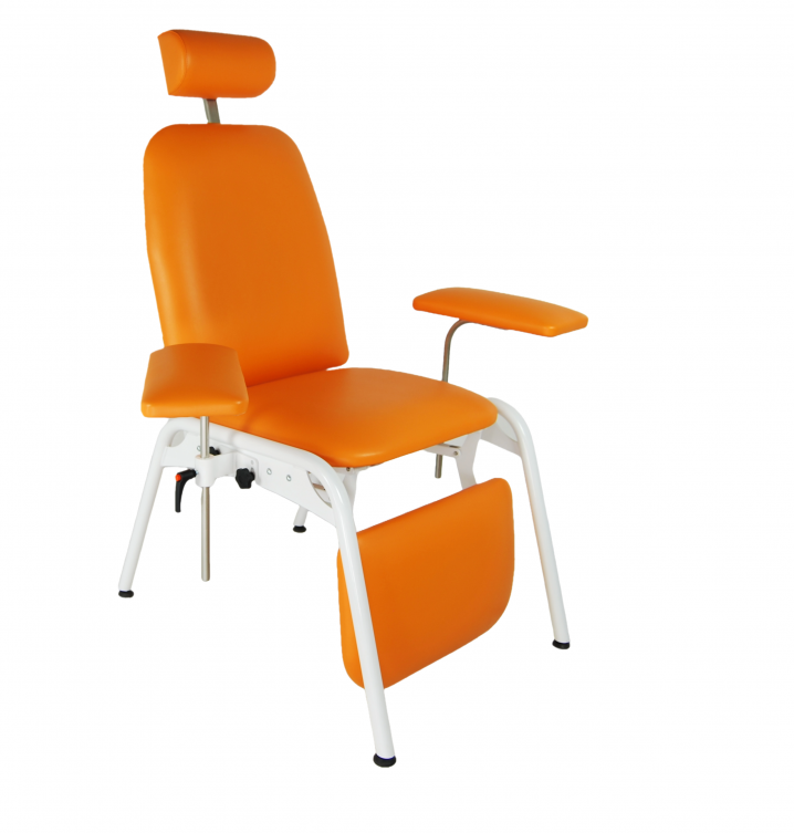 Fotel do pobierania krwi z regulowanym oparciem i podnóżkiem za pomocą sprężyny gazowej.