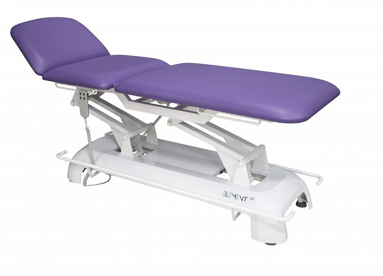 Stacjonarne stoły rehabilitacyjne ELEMENT 03 charakteryzują się obudową z tworzywa ABS która nadaje im nowoczesny wygląd i zapewnia łatwe utrzymanie w czystości. Stół posiada trzyczęściowe leże z regulowanym podgłówkiem i regulacją blatu do pozycji fotela. Regulacja wysokości stołu oraz leża do pozycji fotela odbywa się za pomocą siłownika elektrycznego. Stół posiada stabilną podstawę i w pełni łożyskowane mechanizmy regulacji.