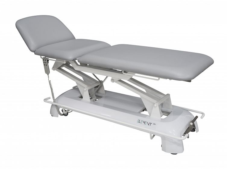 Stacjonarne stoły rehabilitacyjne ELEMENT 04 charakteryzują się obudową z tworzywa ABS która nadaje im nowoczesny wygląd i zapewnia łatwe utrzymanie w czystości. Stół posiada trzyczęściowe leże z regulowanym podgłówkiem i regulacją blatu do pozycji Pivota i fotela. Regulacja wysokości stołu oraz leża do pozycji Pivota i fotela odbywa się za pomocą siłownika elektrycznego. Stół posiada stabilną podstawę i w pełni łożyskowane mechanizmy regulacji.