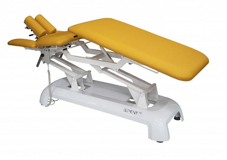 Stacjonarne stoły rehabilitacyjne ELEMENT CH charakteryzują się obudową z tworzywa ABS która nadaje im nowoczesny wygląd i zapewnia łatwe utrzymanie w czystości. Stół posiada sześcioczęściowe leże. Regulacja wysokości stołu odbywa się za pomocą siłownika elektrycznego. Zaletą stołu jest możliwość unoszenia za pomocą sprężyn gazowych, osobno lub razem części lędźwiowej i części piersiowej. Ważną funkcją w oferowanym modelu jest szeroki zakres regulacji podgłówka. Nowoczesne rozwiązanie regulacji położenia do góry i dołu z ustawieniem kąta pochylenia, pozwala na wygodne ułożenie pacjenta Stół posiada stabilną podstawę i w pełni łożyskowane mechanizmy regulacji.