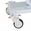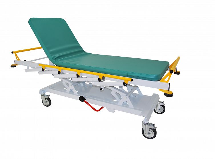TC-02 - Wózek TC-02 przeznaczony jest do transportu chorego w pozycji leżącej na teranie szpitala bądź innych placówek medycznych. Wózek wykonany jest z profili stalowych malowanych proszkowo. Regulacja wysokości wózka odbywa się hydraulicznie. W standardzie wózek wyposażony jest składane barierki boczne, regulowany podgłówek za pomocą sprężyny gazowej oraz krążki odbojowe. Na blat wózka składa się płyta HPL przezierna dla promieni RTG oraz materac z pianki poliuretanowej obszyty materiałem typu MEDITAP.