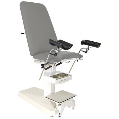 Fotel ginekologiczny FG-R01 z elektryczną regulacją wysokości oraz manualną regulacją oparcia i siedziska.